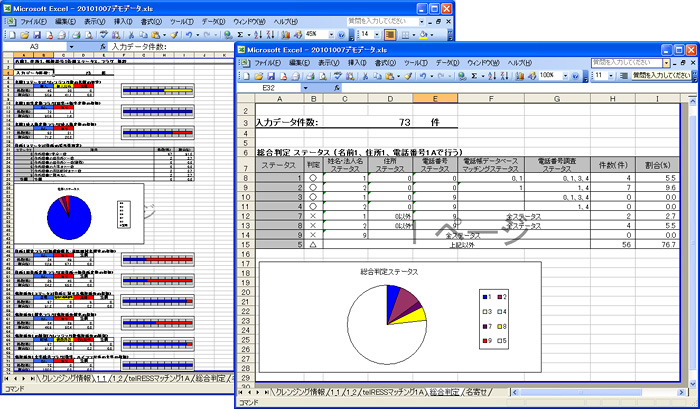 クレンジング処理した結果をExcel ファイルに出力します。各ステータスやフラグの件数を、数値とグラフの両方で視覚的に見ることができます。